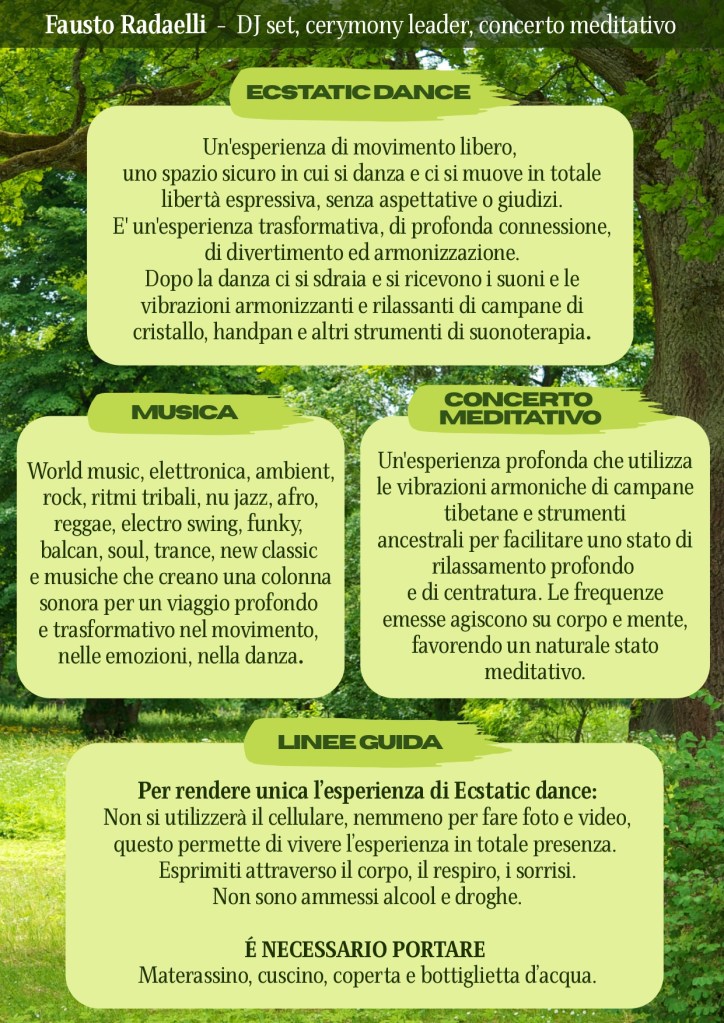20 Giugno ore 18.00Ecstatic dance, concerto meditativo e apericena all’aperto a Colico, via Posallo n.50. Info e prenotazioni: Fausto 3388286879 , mail: gongtransformationgong@gmail.com, Claudia 3389925089