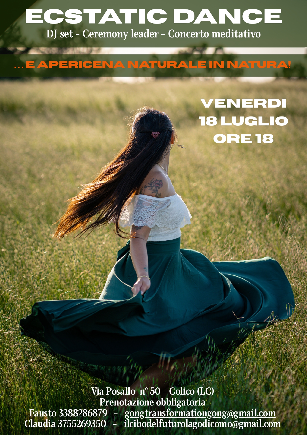 18 Luglio ore 18.00Ecstatic dance, concerto meditativo e apericena all’aperto con cuffie a Colico, via Posallo n.50. Info e prenotazioni: Fausto 3388286879 , mail: gongtransformationgong@gmail.com, Claudia 3389925089 mail: ilcibodelfuturolagodicomo@gmail.com