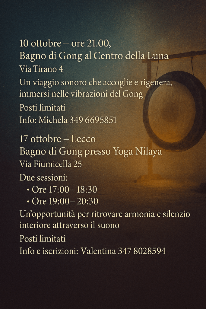 28 Novembre ore 20.30Bagno di Gong al Centro della Luna Via Tirano 4, Morbegno posti limitati. Info: Michela 3496695851