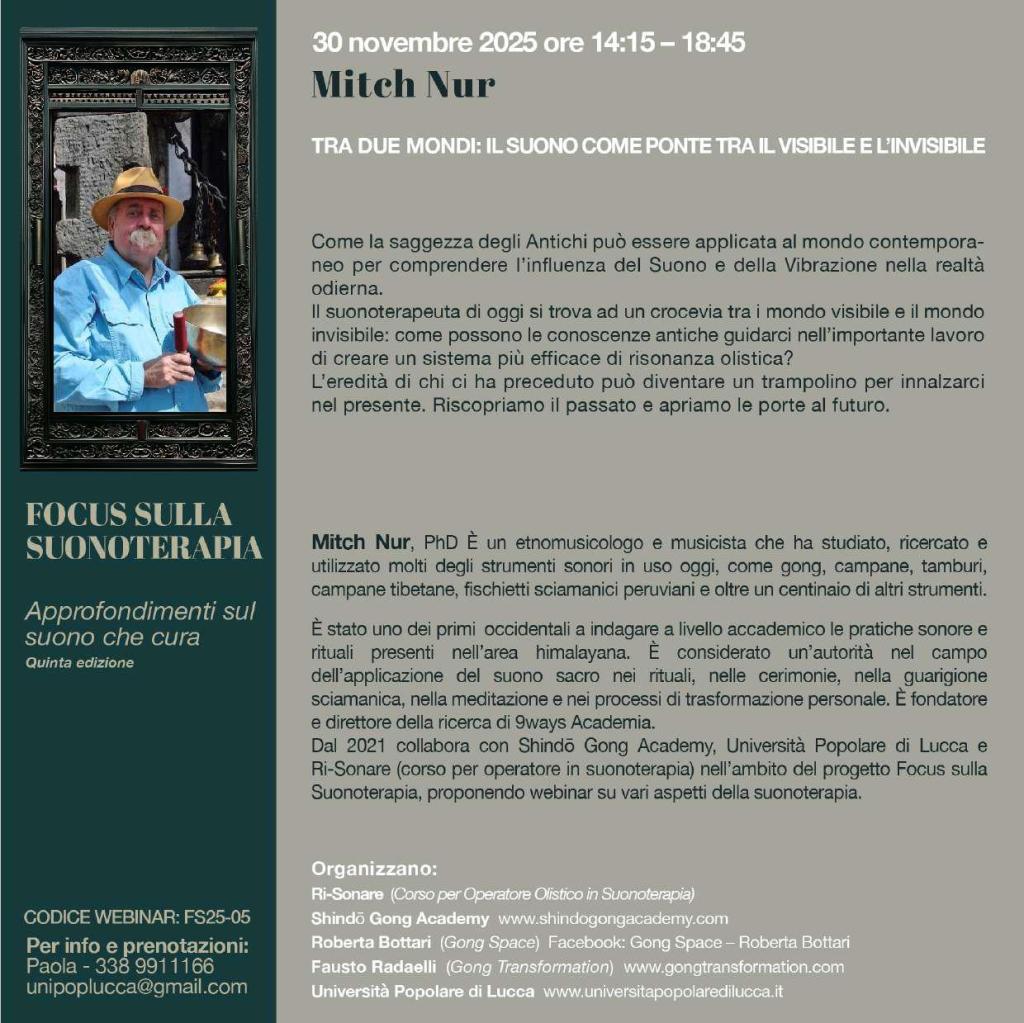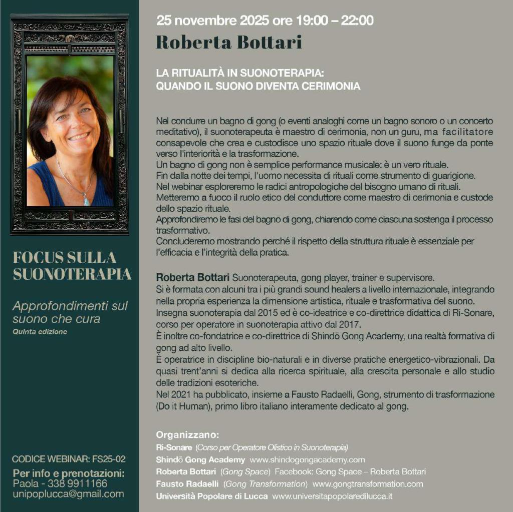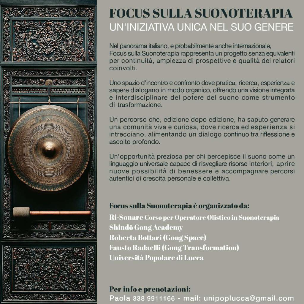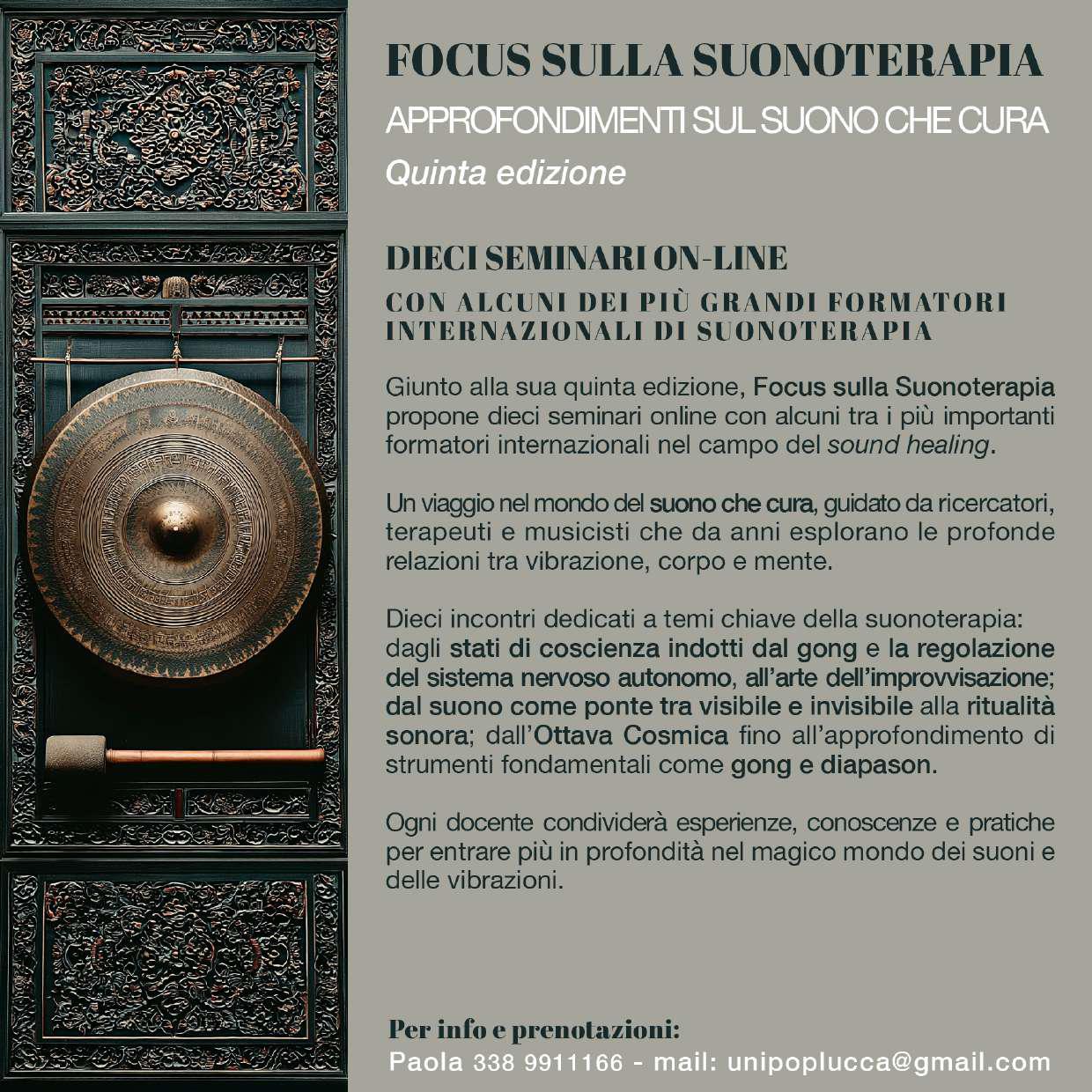 All’interno del ciclo di seminari on line “Focus sulla suonoterapia. Approfondimenti sul suono che cura, quarta edizione” , organizzato da Fausto Radaelli, Roberta Bottari, Ri-sonare, Shindo Gong Academy e Università Popolare di Lucca: