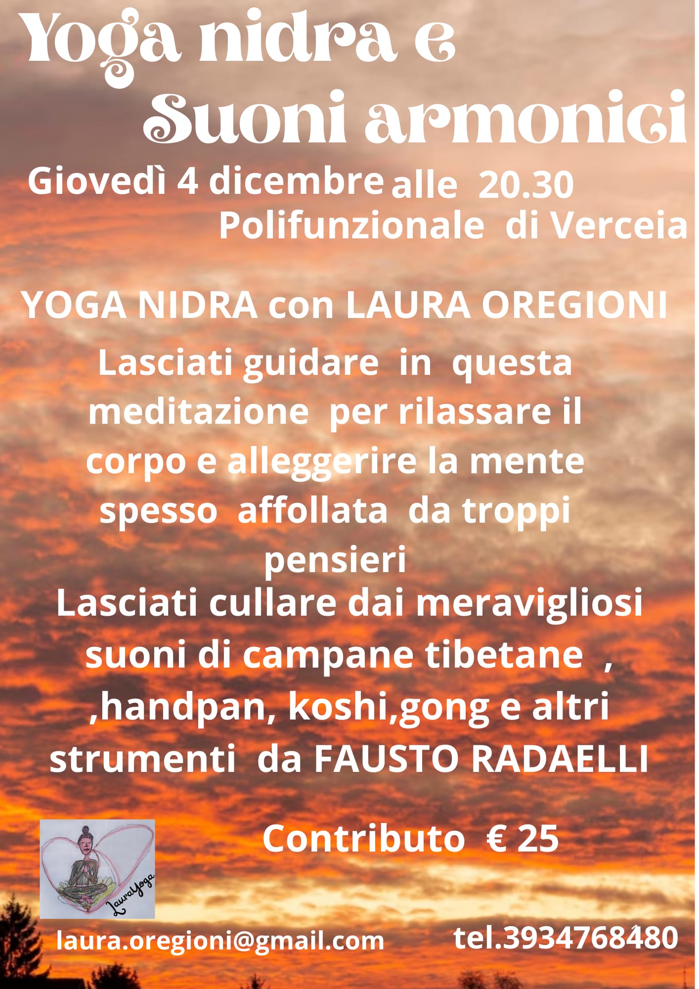 4 Dicembre ore 20.30 Yoga nidra e Suoni armonici presso Centro polifunzionale Verceia (So). Yoga Nidra: Laura Oregioni, Suoni (campane tibetane, handpan, sansula, gong) : Fausto Radaelli Info Laura 3934768480