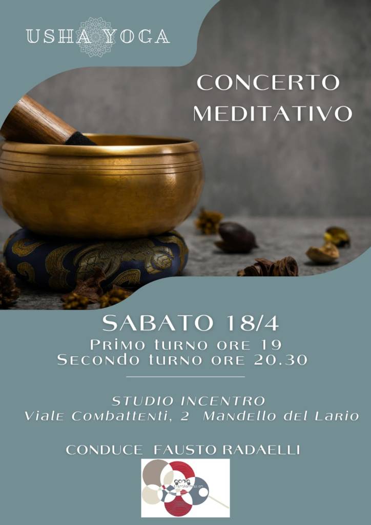 18 Aprile ore 19.00 e ore 20.30 Concerto meditativo presso Usha yoga Studio Incentro, Viale combattenti 2 , Mandello del Lario . Info: Elisa 3345261345 mail:infoushayoga@gmail.com