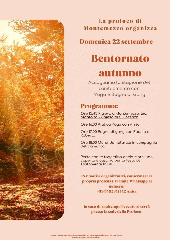 22 Settembre ore 17.00 Bagno di Gong con Roberta Bottari e Fausto Radaelli all’interno dell’evento “Bentornato Autunno” presso prati antistanti la chiesa di San Lorenzo a Montalto (Montemezzo). Programma: ore 15.45 ritrovo alla chiesa di San Lorenzo a Montalto (Montemezzo), ore 16.00 Yoga con Anita e alle 17.00 Bagno di Gong. Ore 18.00 merenda al tramonto. Evento organizzato dalla proloco di Montemezzo. Evento gratuito